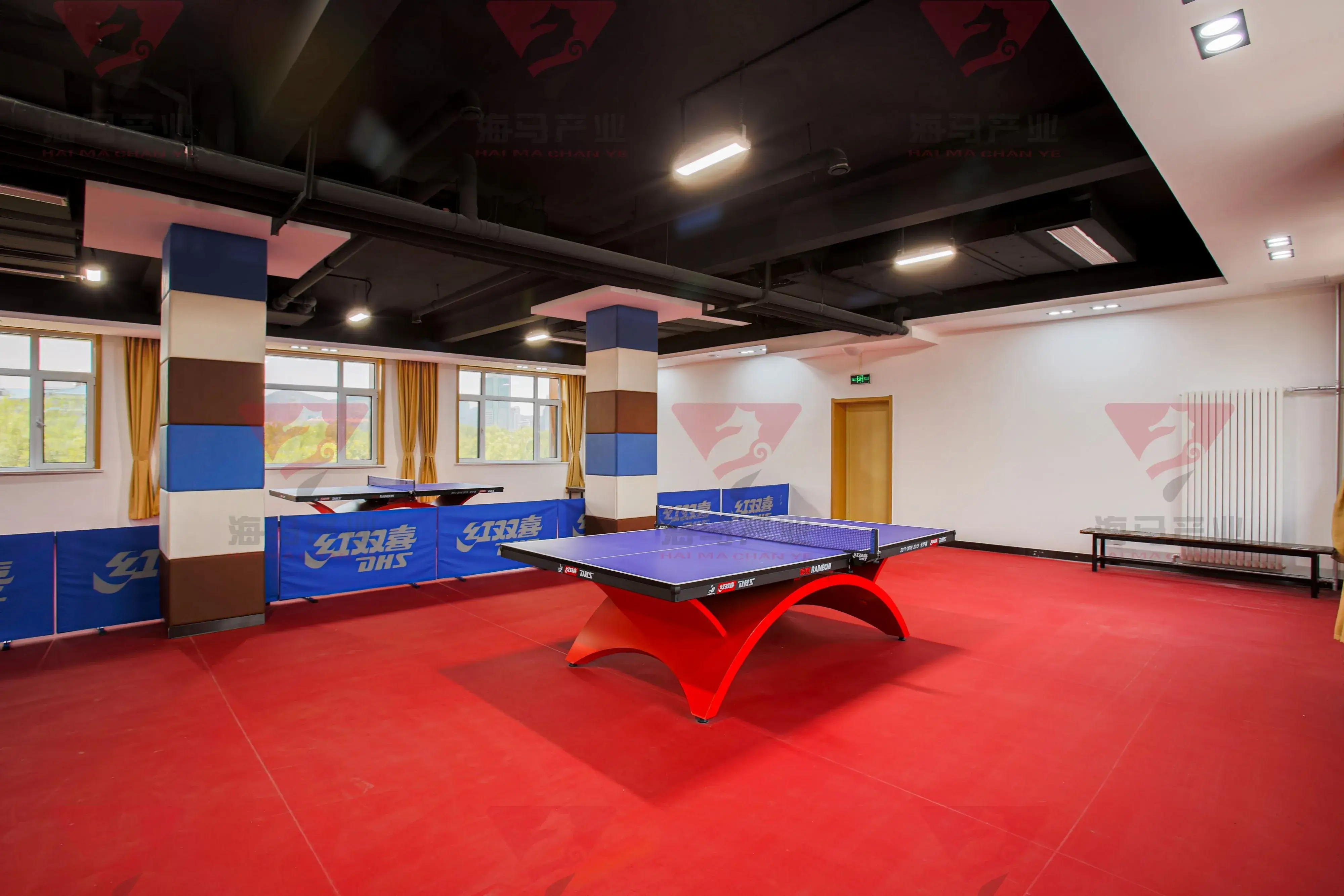 三层乒乓球室,有效面积约为300平方;共设4个乒乓球台。